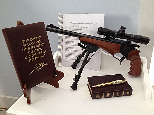 acquitted, and by your words you will be condemned.” Photos are of my workshop, pens, notebooks, bibles & a 44